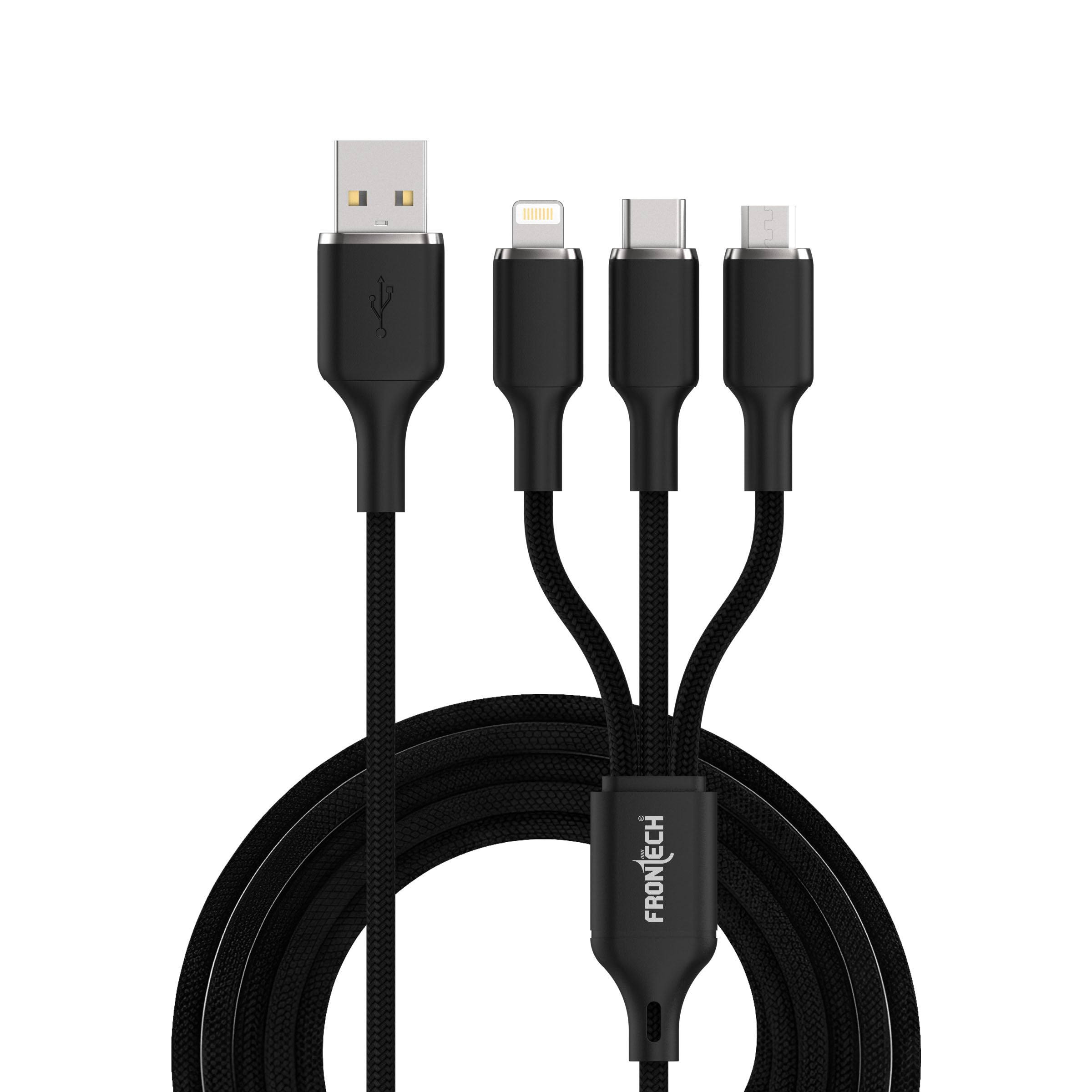 Frontech 3-in-1 Super Fast USB Data Cable | 3.0A Fast Charging & Data Transfer | Lightning + Type-C + Micro USB Port| 1.2 Meter Braided Cable | Safe Smart Chip Protection (Black) (FT-1044)