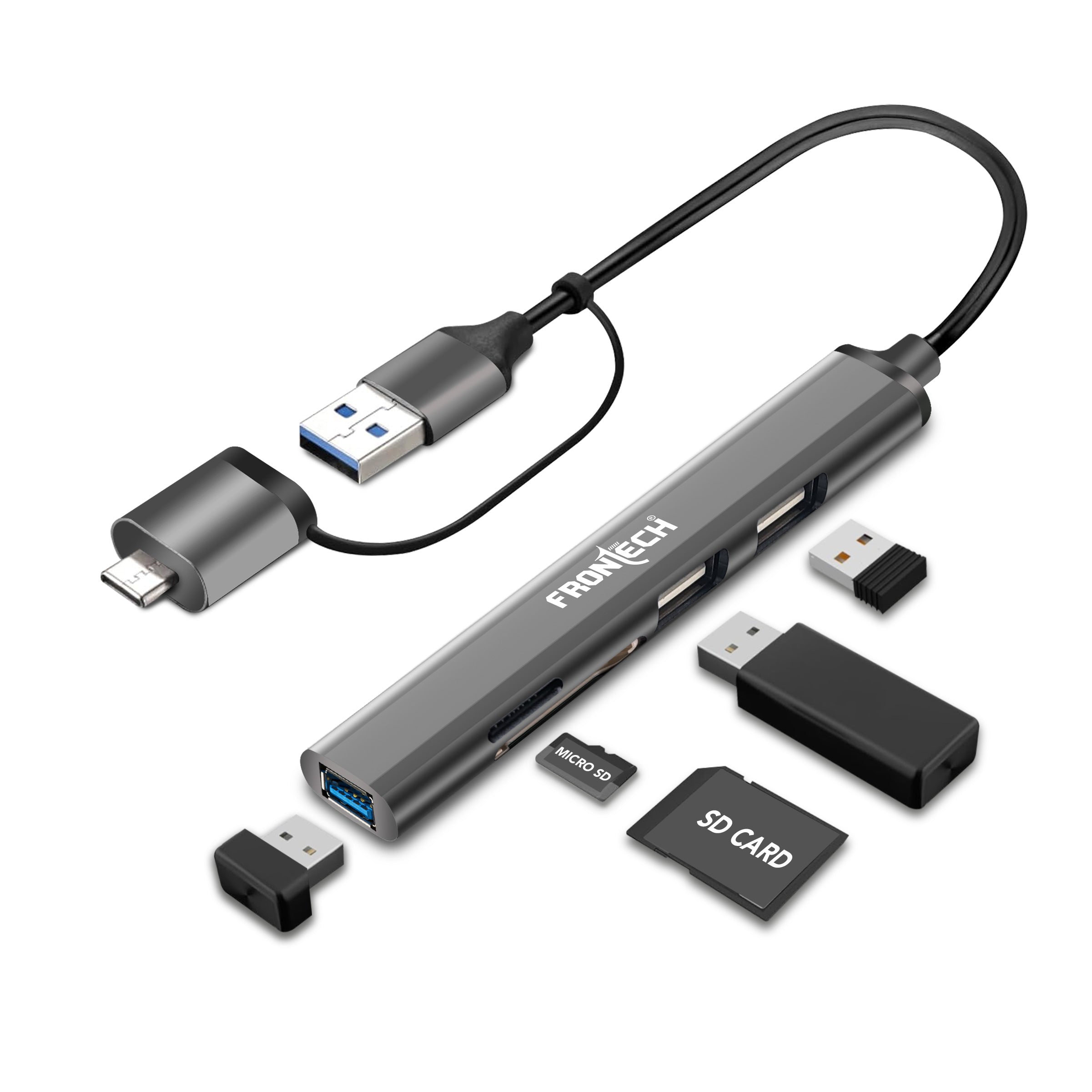 Unleash the full potential of your devices with the FRONTECH 5-in-1 USB Hub, a versatile and essential accessory for modern connectivity. Featuring a high-speed USB 3.0 port (5.0 Gbps), two USB 2.0 ports, and dedicated slots for TF and SD cards, this hub dramatically expands your device's capabilities. Its innovative dual USB Type-A and Type-C input ensures broad compatibility across laptops, tablets, and more, while the durable metal matt finish offers a premium look and feel. Enjoy seamless plug-and-play functionality and wide-ranging compatibility with Mac OS, Windows, Chrome OS, and Android, making it the perfect portable solution for all your data transfer and peripheral connection needs.